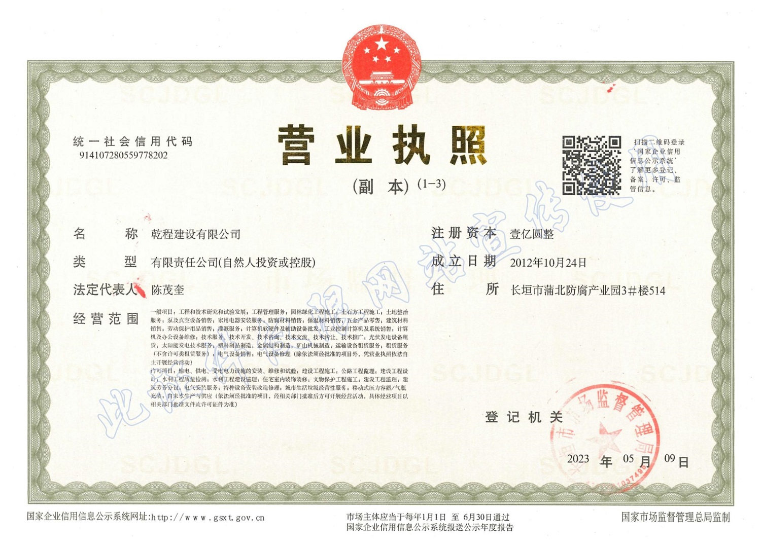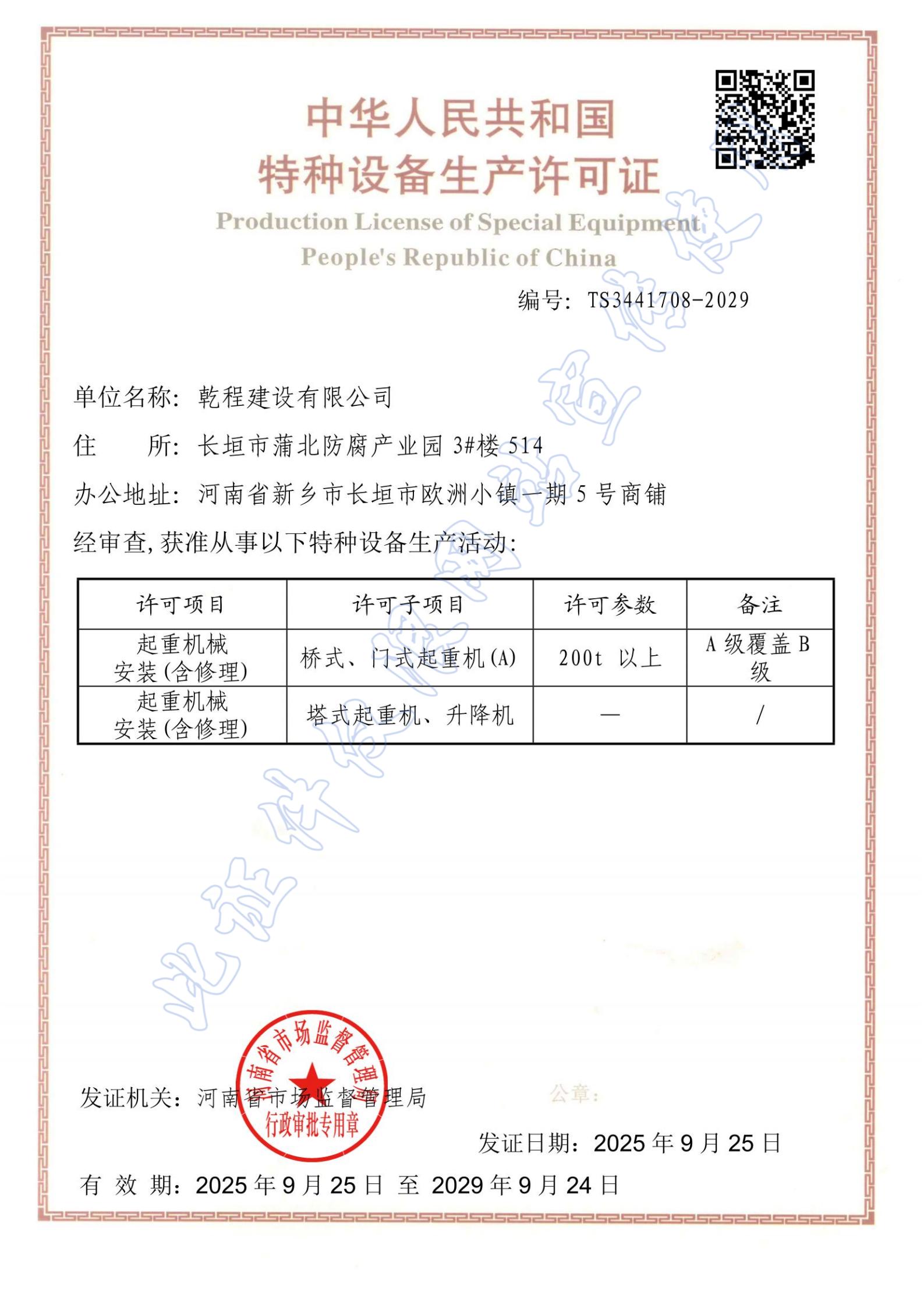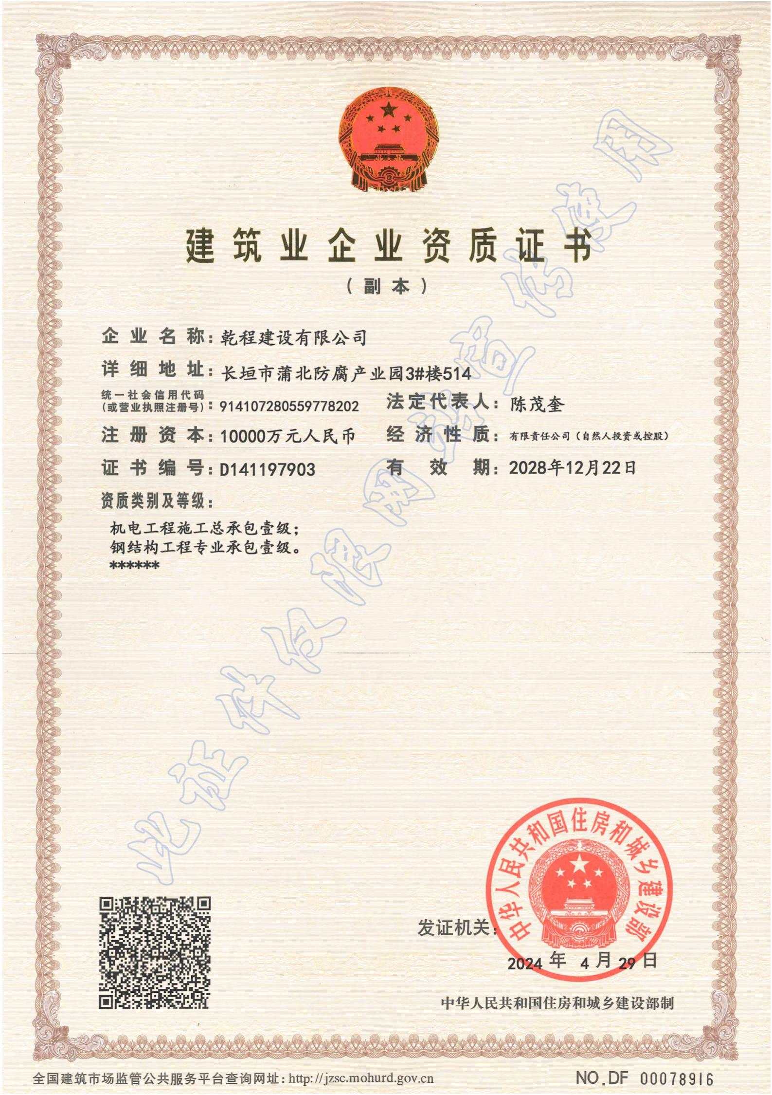 乾程建設有限公司成立于2012年10月,具有機電工程施工總承包壹級資質,建筑工程、電力工程、水利水電工程、冶金工程、石油化工工程、市政公用工程總承包貳級資質;鋼結構、防水防腐保溫、消防設施、建筑幕墻、城市道路照明、古建筑工程專業承包壹級資質,建筑機電安裝、建筑裝飾裝修、輸變電、環保、地基基礎、起重設備安裝、電子與智能化工程專業承包貳級和模板腳手架、施工勞務、各類特種工程等資質;取得了承裝(修、試)電力設施許可證,通過了ISO9001質量管理體系、ISO14001環境管理體系、GB/T45001職業健康安全管理體系認證。